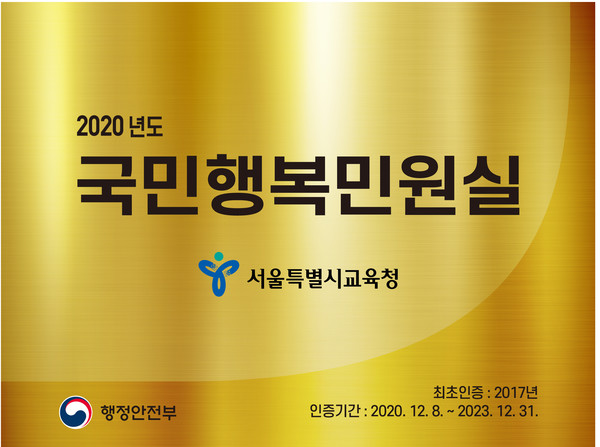 서울특별시교육청(교육감 조희연)은 전국 17개 시·도교육청 최초로 행정안전부에서 주관하는 2020년 국민행복민원실 재인증기관으로 선정되었다.