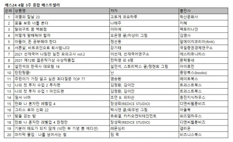 이 밖에도 공무원 시험 대비를 위한 ‘2021 선재국어 나침판 실전 모의고사 vol.2’가 7위에 올랐고, 제12회 젊은작가상을 수상한 7개 작품을 엮은 ‘2021 제12회 젊은작가상 수상작품집’은 여섯 계단 하락해 8위에 안착했다. 전 하버드대 심리학 교수 조던 피터슨의 신작 ‘질서 너머’는 다섯 계단 내린 14위, 뮤지션 유희열의 에세이 ‘밤을 걷는 밤’은 17위다. 후회가 사라지고 오해가 줄어드는 기분 사용법 ‘기분이 태도가 되지 않게(10만부 기념 봄 에디션)’는 한 계단 내려 18위를 기록했으며, 두뇌 전문가가 잠재력을 끌어올리는 마인드셋 비법을 일러주는 ‘마지막 몰입: 나를 넘어서는 힘’이 20위로 나타났다.