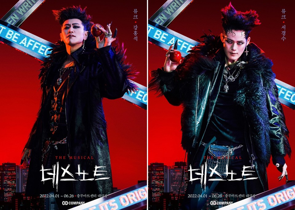 괴짜 사신으로 따분함을 달래기 위해 인간계에 일부러 데스노트를 떨어뜨려 사단을 만든 장본인 ‘류크’ 역에는 강홍석, 서경수가 함께 한다. 강홍석은 뮤지컬 <하데스타운>, <킹키부츠>, <엘리자벳>, <드라큘라>를 비롯해 드라마까지 장르를 구분하지 않고 독특한 소재의 작품에서 개성 넘치는 캐릭터로 긴장감과 재미를 아우르는 믿고 보는 배우이다. 능청스러움과 비정한 사신의 모습을 넘나들며 캐릭터와 혼연일체 되어 극찬 받았던 만큼 한층 더 강렬해진 사신(死神)으로 돌아온다. 지난해 제5회 ‘한국뮤지컬어워즈’에서 뮤지컬 <썸씽로튼>으로 남우조연상을 수상한 서경수는 데뷔 후 대극장과 소극장을 종횡무진 누비며 탄탄한 필모를 쌓아온 배우이다. 매 작품마다 풍부한 캐릭터 표현력으로 인생 캐릭터를 경신한 만큼 ‘류크’ 역을 통해 생동감 넘치는 연기로 극에 몰입도를 더하고 또 하나의 인생 캐릭터를 탄생시킬 것이다.