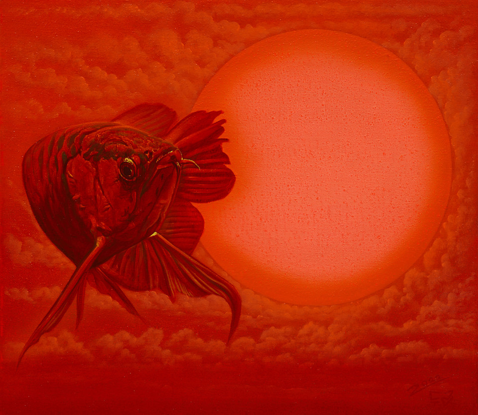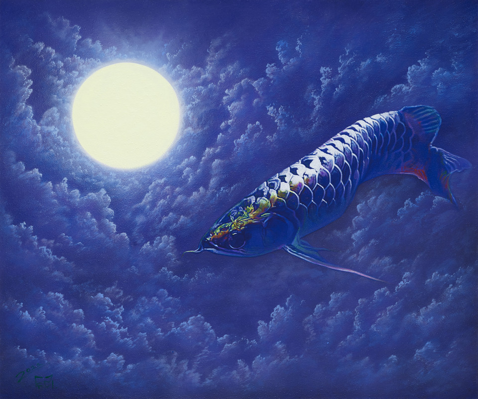 작가 이두리 에게 물고기는 신비의 영역이고 자신의 영혼을 깨치는 영물과도 같은 존재다. 게다가 아시안아로와나 와의 만남은 그림의 모티프가 되었다. 아로와나는 살아 있는 화석으로 불리는 신비한 고대 어종이다. 동서양에서 등장하는 상상의 동물인 ‘용’의 형상을 닮았다. 밝음 속에서 슬픔이 구름처럼 뭉실뭉실 피어오른 이두리의 작품배경은 거대한 태양 둘레에 운무 (雲霧)가 자욱하고 계곡처럼 깊은 구름이 출렁이고 있다. 마치 동굴 속으로 빨려 들어가는 신비한 붉은 연기처럼 강한 에너지가 충만하다. 그리고 아로와나는 중심부에 구름과 태양 주위를 떠돌며 우주와 인간을 지배하듯 엄중하면서 자연스럽게 순회하고 있다.