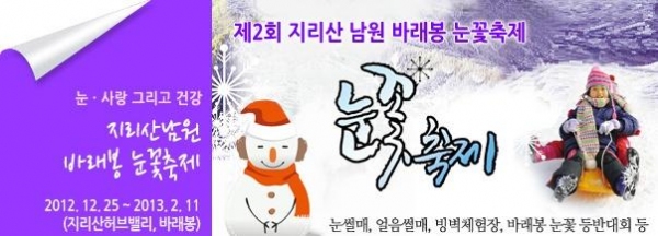 지리산 남원 바래봉 눈꽃 축제가 열리는 남원의 운봉 바래봉 허브밸리는 해발 500∼600m로 눈이 내리면 잘 녹지 않고 풍부한 적설량을 자랑하는 고원지대로서, 매년 대자연의 아름다운 은빛 설원을 뽐내며 아시아의 알프스로 여겨진다.
