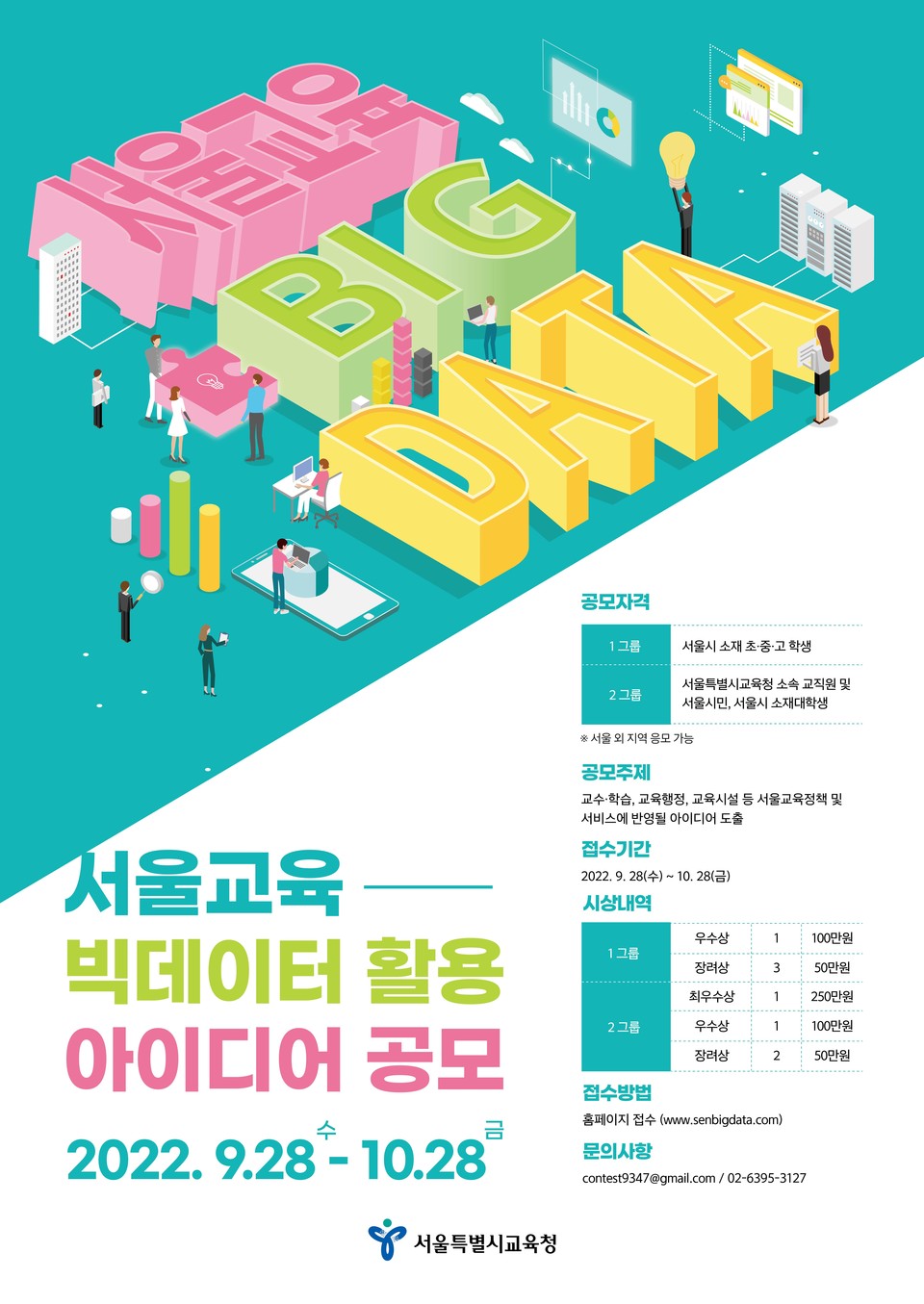 서울특별시교육청(교육감 조희연)은 『제4회 서울교육 빅데이터 활용 아이디어 공모전』을 2021년에 이어 네 번째로 실시하며, 10월 28일(금)까지 접수를 받는다.