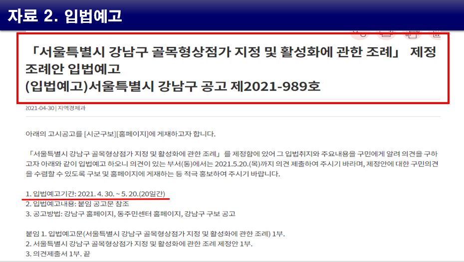 본의원은 관련 조례를 준비하던 중 강남구 골목형상점가 지정 및 활성화에 관한 조례안이 21년 4월 입법예고 되어 있었다는 사실을 알게 되었습니다.