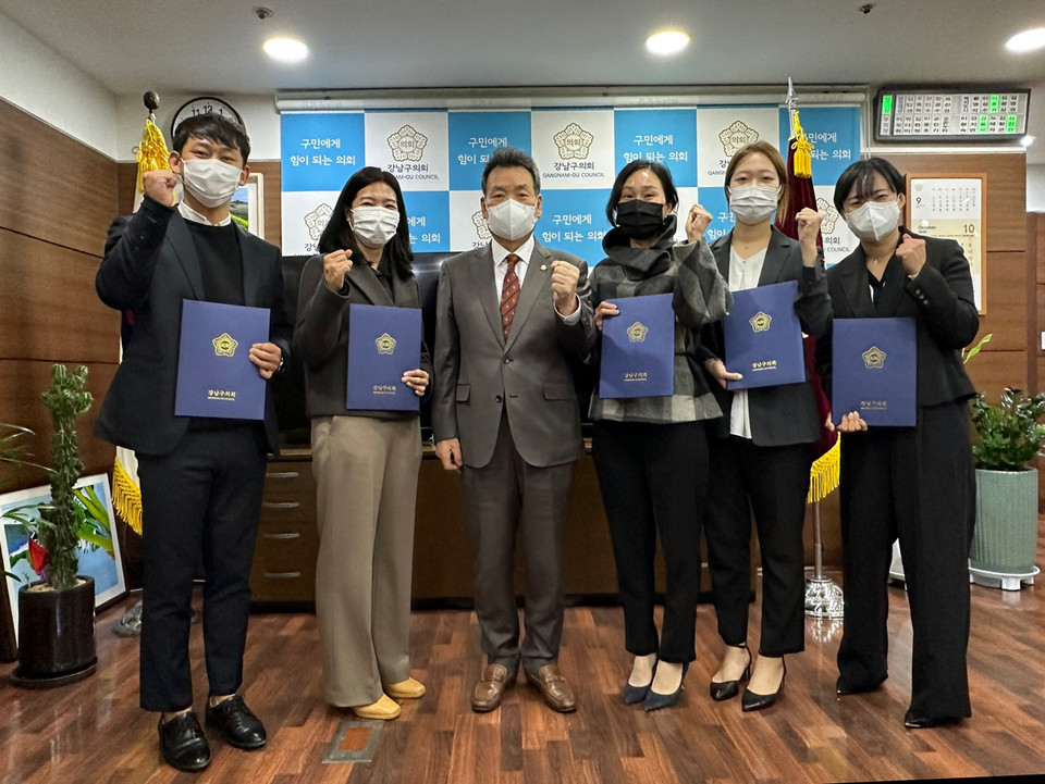 강남구의회는 18일 오전 의장실에서 정책지원관 5명에게 임용장을 수여했다.