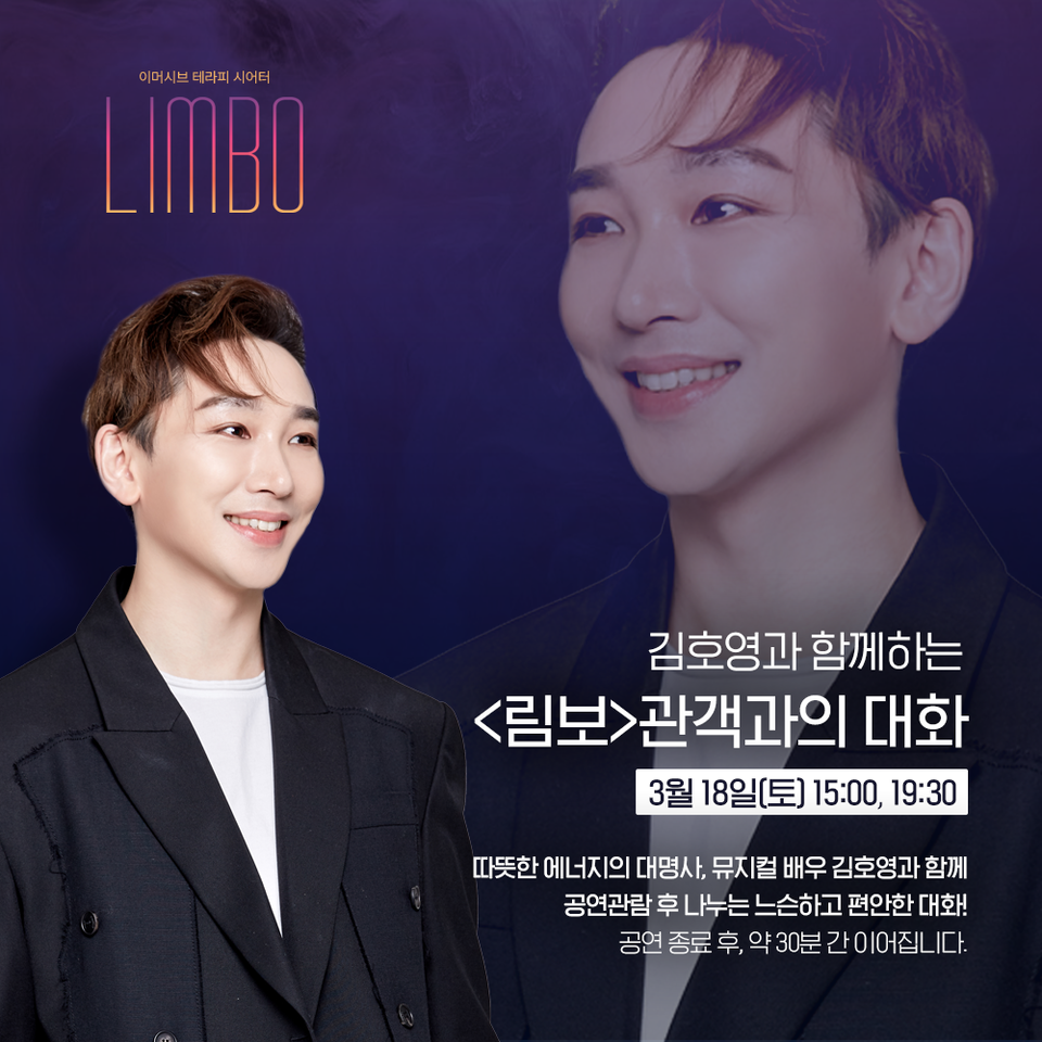 특별히 3월 18일(토) 2회의 공연은 공연 종료 후, 뮤지컬 배우 김호영이 모더레이터로 참여하는 관객과의 대화를 진행한다. 최근 방송 <진격의 언니들>을 통해 뜨거운 공감과 따뜻한 위로로 화재가 되고 있는 김호영은 <림보>를 함께 관람하고 관객들과 마음을 나눌 예정이다.