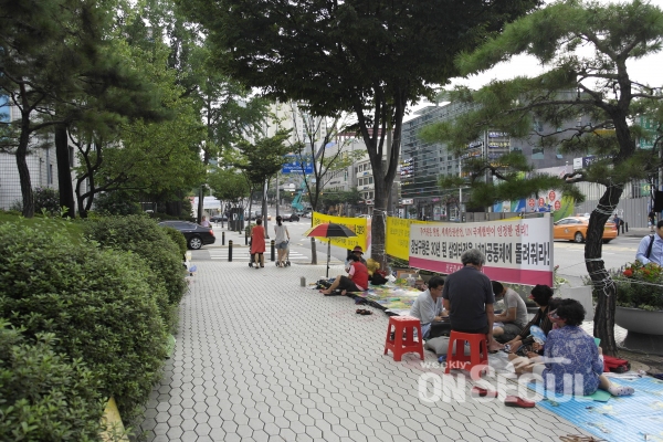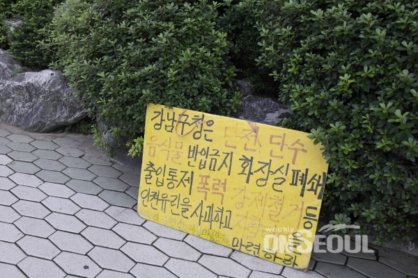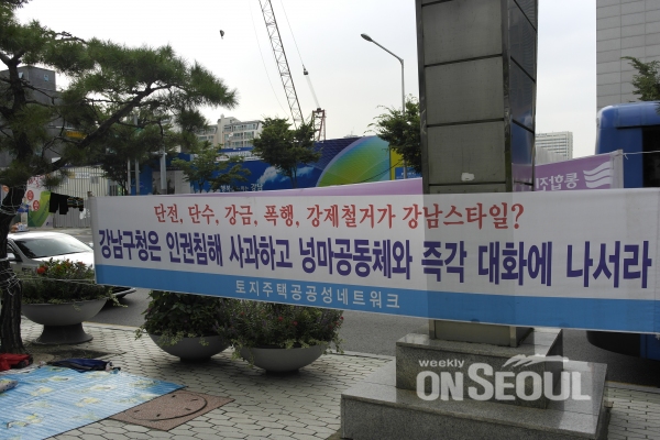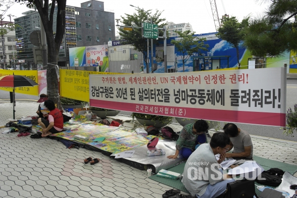 서울 강남구 개포동 소재 영동5교 일대의 판자촌 강제철거를 두고 강남구청과 대립하고 있는 넝마공동체가 지난 달 31일부터 강남구청 정문 옆 인도에서 시위를 재개했다.(사)바르게살기운동 강남구협의회가 같은 장소에서 시위를 하는 동안 동쪽으로 약 50m 장소를 옮겨 시위를 이어온 넝마공동체는 강남경찰서에 오는 3일까지 구청 정문 옆 인도에 대한 집회신고를 마친 것으로 전해진다.