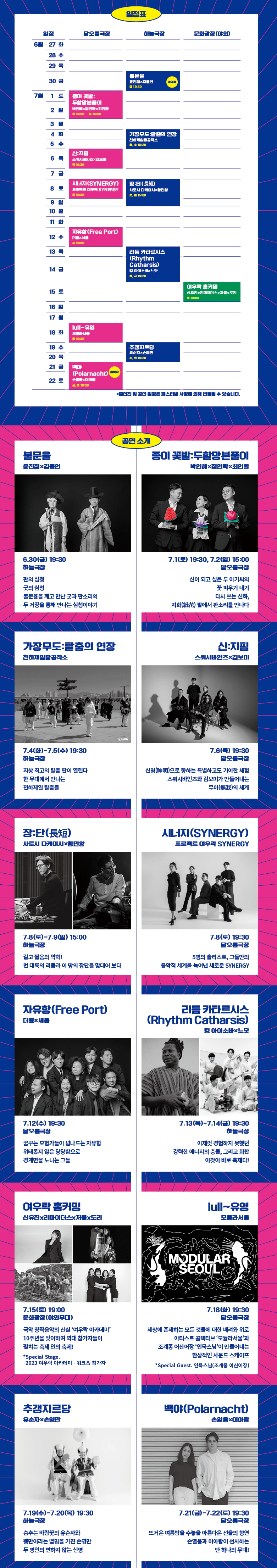 문화와 장르의 경계를 허무는 무대도 만나볼 수 있다. 뉴욕을 거점으로 활동하는 드러머 사토시 다케이시와 전통연희에 기반을 두고 있는 타악 연주자 황민왕이 <여우락>에서 8년 만에 재회해 우리 전통 리듬의 새로운 확장을 꾀한다. 아프리카 가나 출신의 전통 현악기 연주자 킹 아이소바(King Ayisoba)와 사물놀이 그룹 느닷은 아프리카 특유의 힘과 한국의 흥으로 신명 가득한 폭발적 무대를 선사한다. 전통음악 기반의 포스트 록 밴드 잠비나이의 해금 연주자 김보미는 4인조 록 밴드 스쿼시바인즈와 만나 용광로처럼 뜨거운 무대를 전한다. 모듈러신스를 기반으로 전자음악의 가능성을 실험하는 아티스트 그룹 모듈라서울은 불교 의식에서 사용되는 네 가지 악기인 불전사물 소리에 그들만의 음악적 색채를 더해 세상에 위로를 건네는 무대를 선보인다. 여기에 대한불교조계종의 어산어장 인묵스님과 어산종장 동환스님이 특별 출연해 불교 음악의 정수를 보여준다. 세계적인 피아니스트 손열음과 대금 연주자 이아람은 폐막작 <백야>를 통해 클래식과 전위음악, 전통창작음악까지 폭넓은 음악들로 축제의 대미를 장식한다.