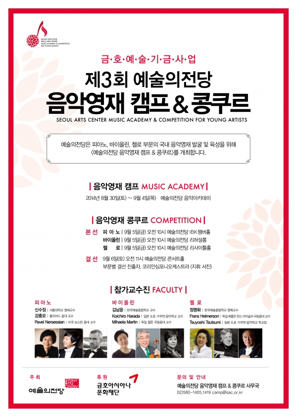 지난 6월 진행된 라이브 오디션을 통하여 바이올린, 첼로, 피아노 등 3개 부문에서 총 36명이 최종 선발됐다. 참가자들은 오는 30일부터 시작하는 캠프 기간 동안 예술의전당 내 음악아카데미에서 지도 교수진들로부터 레슨을 받으며, 다음달 5일(금) 예술의전당 IBK챔버홀과 리사이틀홀, 리허설룸에서 본선 콩쿠르를 거쳐 각 부문별 1명씩 총 3명의 우승자들이 선정된다. 이들 3명의 연주자에게는 9월 6일(토) 예술의전당 콘서트홀에서 서진이 지휘하는 코리안심포니오케스트라와의 협연기회가 주어지며, 이 음악회를 통해 ‘금호영재대상’ 1명과 ‘음악영재상’ 2명이 최종 선정된다. ‘금호영재 대상’ 수상자에게는 상금 미화 5,000달러와 예술의전당 기획공연 협연 및 금호아트홀에서 독주회 기회, 금호아시아나문화재단 후원 프로그램 혜택을 제공하며, ‘음악영재 상’ 수상자 2명에게는 각각 상금으로 미화 2,500달러와 금호아트홀에서의 독주회 기회를 제공한다.