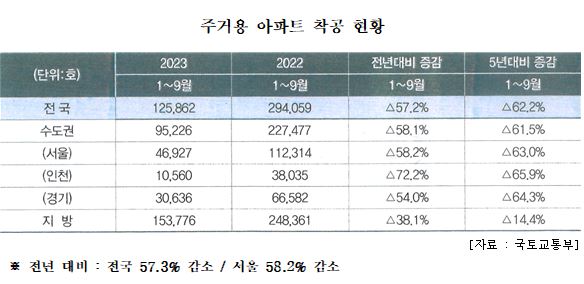 ▶첫째, 작년 말 서울의 경우 아파트 착공이 전년 및 5년을 비교해도 약 60%가 줄어 계획 대비 반토막 수준이다.(국토부 통계) ▶둘째, 금리 및 자재와 인건비가 급상승하여 사업 원가 대비 집값 하락으로 건설 의욕상실은 공급량 축소 원인 제공. ▶셋째, 집값 상승기에 만든 재건축 분담금, 투기지역, 절차 및 대출, 세금 등 대못 규제들이 지금도 많이 현존하여 사업진행상 악영향. ▶넷째, 일몰 및 직권해제 등 재생지역 소멸, 경기하락 및 동의율 저조로 재추진이 난해하나 새집 선호와 1인 가구 증가로 수요 상승 ▶끝으로, 1기 재생 및 3기 대량공급처인 수도권 신도시는 경제 및 형평성과 환경 악화 문제로 신속 추진상에 난항이 예견된다.(시범지역 선정 등)