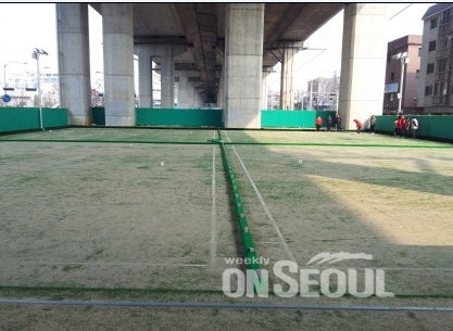 거여고가 하부 1,500㎡ 부지는 한국도로공사 소유로 구는 이 부지를 임차해 콘크리트 바닥 위에 인조잔디를 깔아 체육 시설을 마련했다.