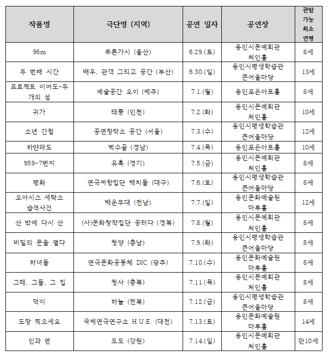 제42회 대한민국연극제 용인 본선 경연 작품은 아래와 같다. 모든 작품은 6.29.(토)에서 7.14.(일) 중 하루 간 2회씩(15:00, 19:30) 공연된다.