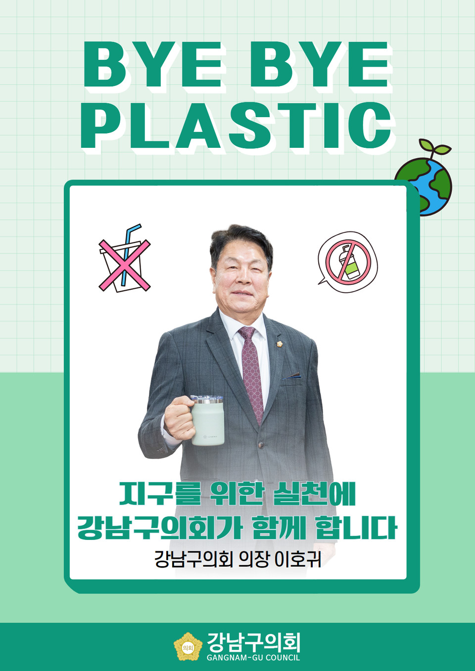 강남구의회 이호귀 의장은 24일 플라스틱 사용을 줄이기 위한 범국민 캠페인‘바이바이 플라스틱 챌린지(Bye Bye Plastic)’에 동참했다.