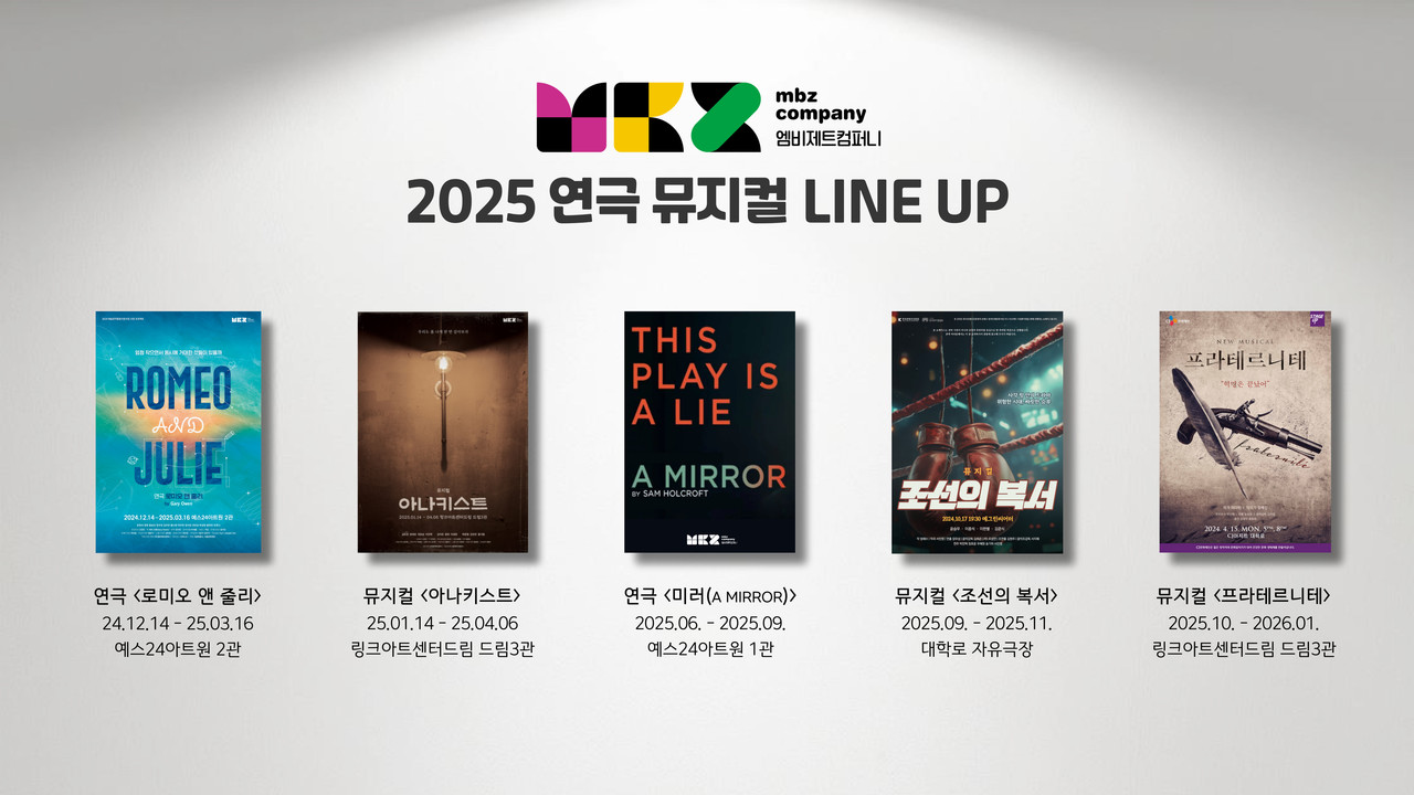 연극 <로미오 앤 줄리>는 예스24아트원 2관에서 12월 개막해 2025년 3월 16일(일)까지, 뮤지컬 <아나키스트>는 링크아트센터드림 드림3관에서 2025년 1월 14일(화)부터 4월 6일(일)까지 공연된다. 이 작품들을 포함한 2025년 공연 소식은 엠비제트컴퍼니 공식 SNS(X: @mbz_company, 인스타그램: @mbz_company)에서 확인할 수 있다.
