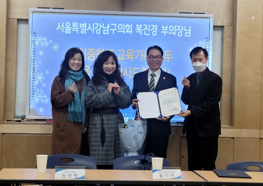 강남구의회 복진경 부의장(삼성1,2동, 대치2동)이 지난 23일(월) 대치중학교장과 학부모회, 학교운영위원회가 공동으로 수여하는 감사장을 받았다.