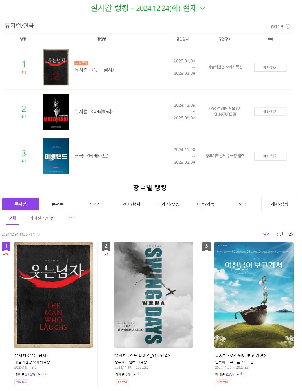 2025년 최고 기대작 뮤지컬 ‘웃는 남자’가 2차 티켓 오픈에서도 압도적인 예매율로 1위를 기록했다.