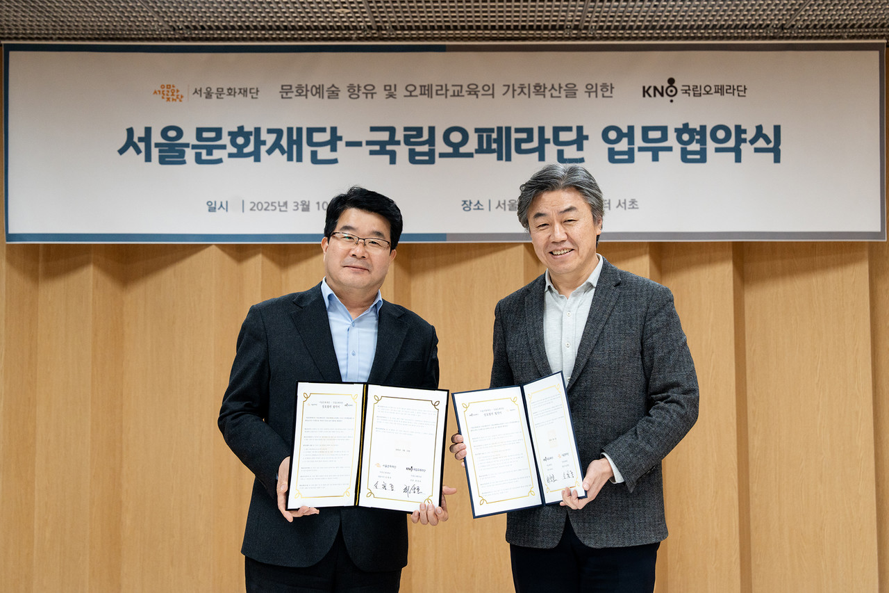 서울문화재단(대표이사 송형종)과 국립오페라단(단장 최상호)은 지난 10일(월) 오후 2시 서울문화예술교육센터 서초에서 문화예술교육 상호 협력을 위한 업무협약(MOU)를 체결했다. 이번 협약은 서울시와 서울문화재단이 음악 특화 예술교육센터로 지난해 11월에 개관한 서울문화예술교육센터 서초의 운영 활성화와 오페라교육의 가치 확산을 목표로 두고 있다.