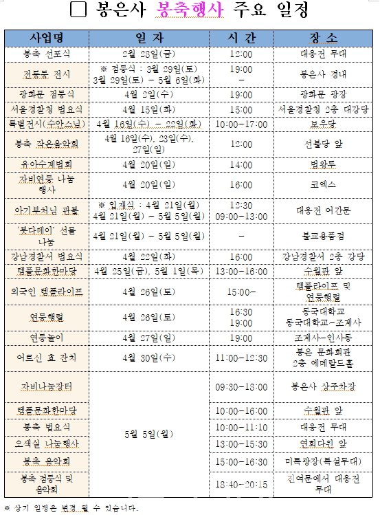 지난 2월 28일(금) ‘봉축 선포식’을 시작으로 강남의 대표적 지역문화행사로 자리매김한 ‘제 28회 전통등 전시회‘ 개막 점등식(3월 29일, 토)으로 본격적인 부처님오신날을 알릴 예정이다.