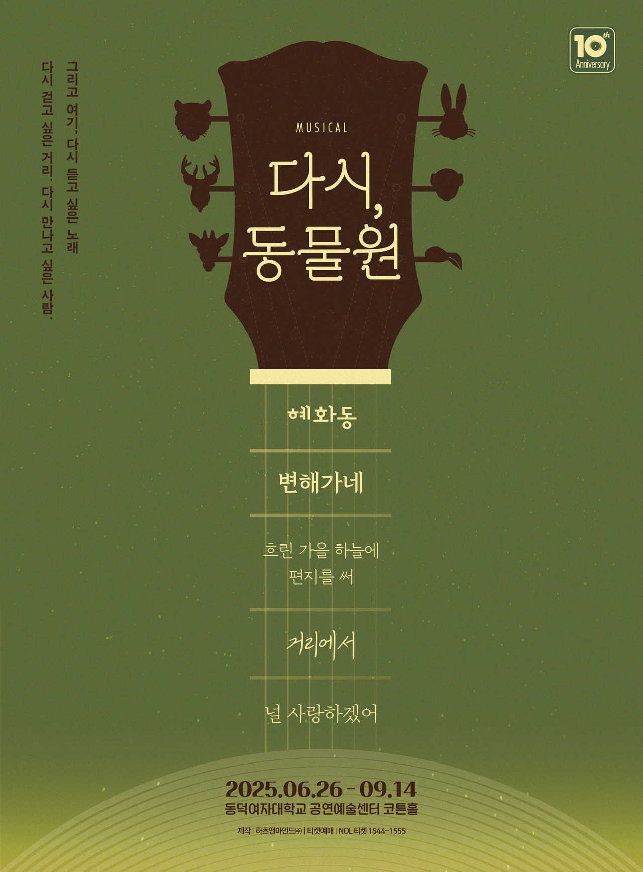 이번 시즌은 뮤지컬 <다시, 동물원>의 10주년을 기념하는 만큼, 원작의 감성을 더욱 정교하게 살려냈다. 작품 속에는 ‘혜화동’, ‘흐린 가을 하늘에 편지를 써’, ‘서른 즈음에’, ‘널 사랑하겠어’, ‘사랑했지만’ 등 동물원의 대표곡들이 총망라되어 있으며, 주요 넘버들은 배우들의 라이브 연주로 관객에게 전달된다. 무대 위에서 흘러나오는 한 곡 한 곡은 단순한 음악을 넘어, 관객들의 청춘과 추억을 불러내는 감정의 매개체가 된다.