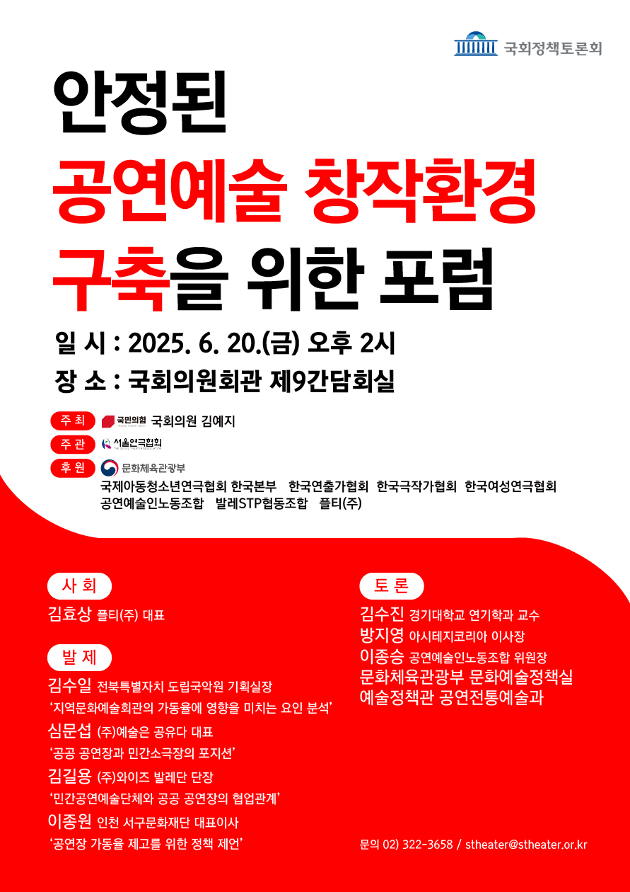 금일 6월 20일 금요일 14시 국회의원회관 제9간담회에서 <안정된 공연예술 창작환경 구축을 위한 포럼>이 개최된다. 국민의 힘 김예지 국회의원이 주최하고, 서울연극협회가 주관한 본 포럼은 공연예술인들이 보다 나은 창작환경 속에서 안정된 생태계를 구축하고자 하는데 그 취지를 갖고 있다. 이 날의 포럼은 지난 2024년 11월 22일 국민의 힘 김예지 국회의원이 대표발의한 공연법 일부개정안에 기초하고 있는데 주요한 내용은 공공 공연장의 가동률을 상향하고 이를 의무화하는 것이다.