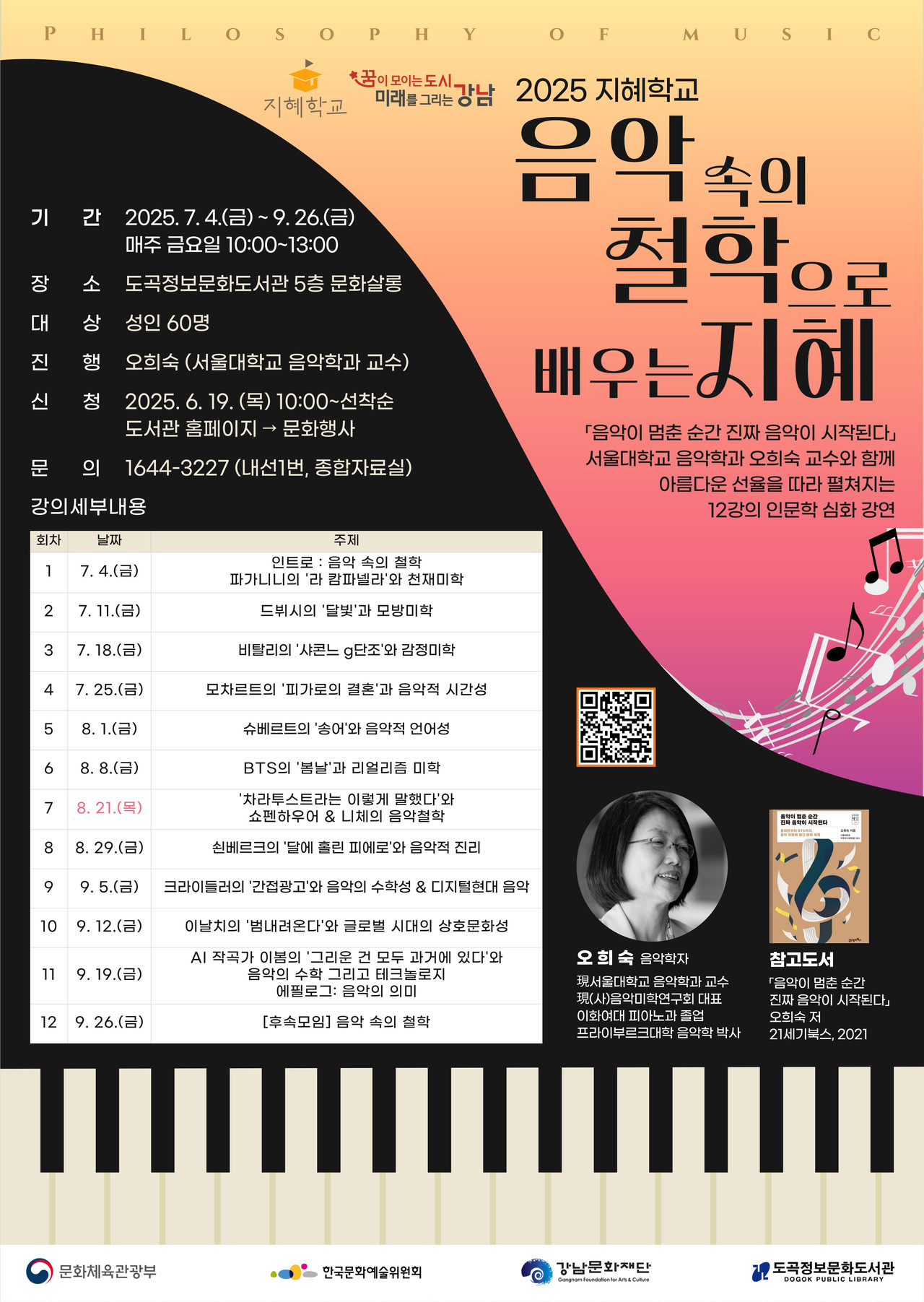 (재)강남문화재단(이사장 김종섭)이 운영하는 도곡정보문화도서관은 7월 4일(금)부터 9월 26일(금)까지 2025 지혜학교 ‘음악 속의 철학으로 배우는 지혜’를 운영한다.