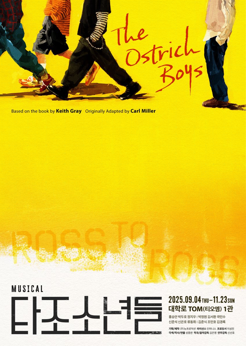 오는 9월 4일(목)부터 11월 23일(일)까지 대학로 TOM(티오엠) 1관에서 공연되는 뮤지컬 <타조 소년들>은 영국의 인기 작가 키스 그레이의 장편 소설 ‘Ostrich boys’를 원작으로 한 작품이다. ‘Ostrich boys’는 출간 당시 단숨에 영국 베스트셀러에 오르며 선풍적인 인기를 끌었으며 칼 밀러가 각색하고 토니 그래함이 연출한 연극 <타조 소년들> 또한 한국 국립극단에서 무대화되어 성황리에 상연된 바 있다.