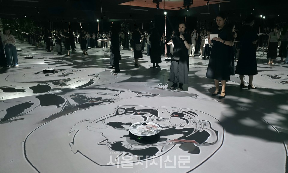 홍콩 미디어 아티스트 장한겸 정(XCEED)의 AI 기반 몰입형 작품 <감성의 연못 – 서울 판(Sentient Pond – Seoul Edition)>은 관람객의 움직임을 감지해 실시간으로 고유한 회화를 생성하는 참여형 전시로, 예술과 기술의 융합을 선보인다.
