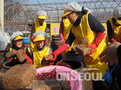 서초구 직원부인자원봉사단 30여명은 15일 원지동 소재 대원농장에서 홀몸어르신, 소년소녀가장 등 300세대에 전달할 ‘제14회 사랑의 된장·간장 담가주기 행사’를 펼쳤다. 1999년 처음 시작된 이 행사는 지금까지 총 2,698세대에 된장과 간장을 전달했다.