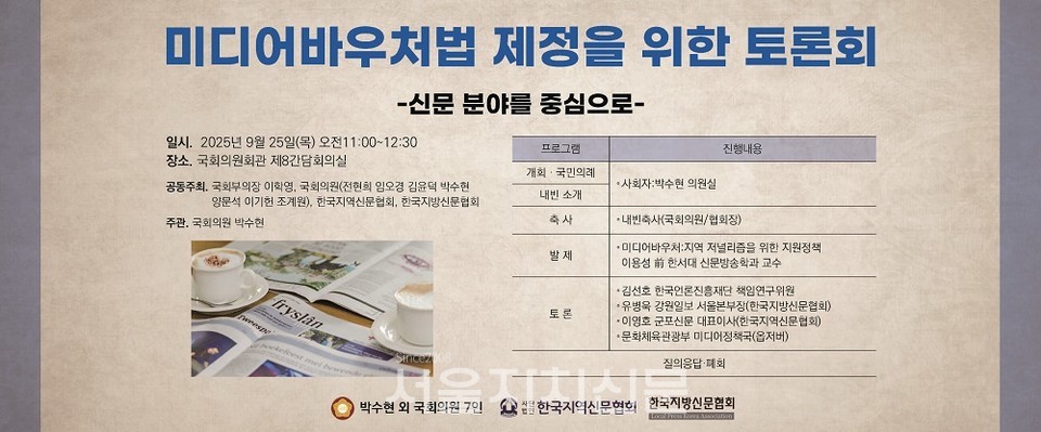이학영 국회부의장, 전현희 더불어민주당 최고위원, 임오경 민주당 간사를 비롯한 국회 문화체육관광위원회 김윤덕, 박수현, 양문석, 이기헌, 조계원 등 국회의원 8명이 한국지역신문협회, 한국지방신문협회와 오는 9월 25일 오전11시 국회 의원회관 제8간담회의실에서 [미디어바우처법] 제정을 위한 토론회를 공동 개최한다.