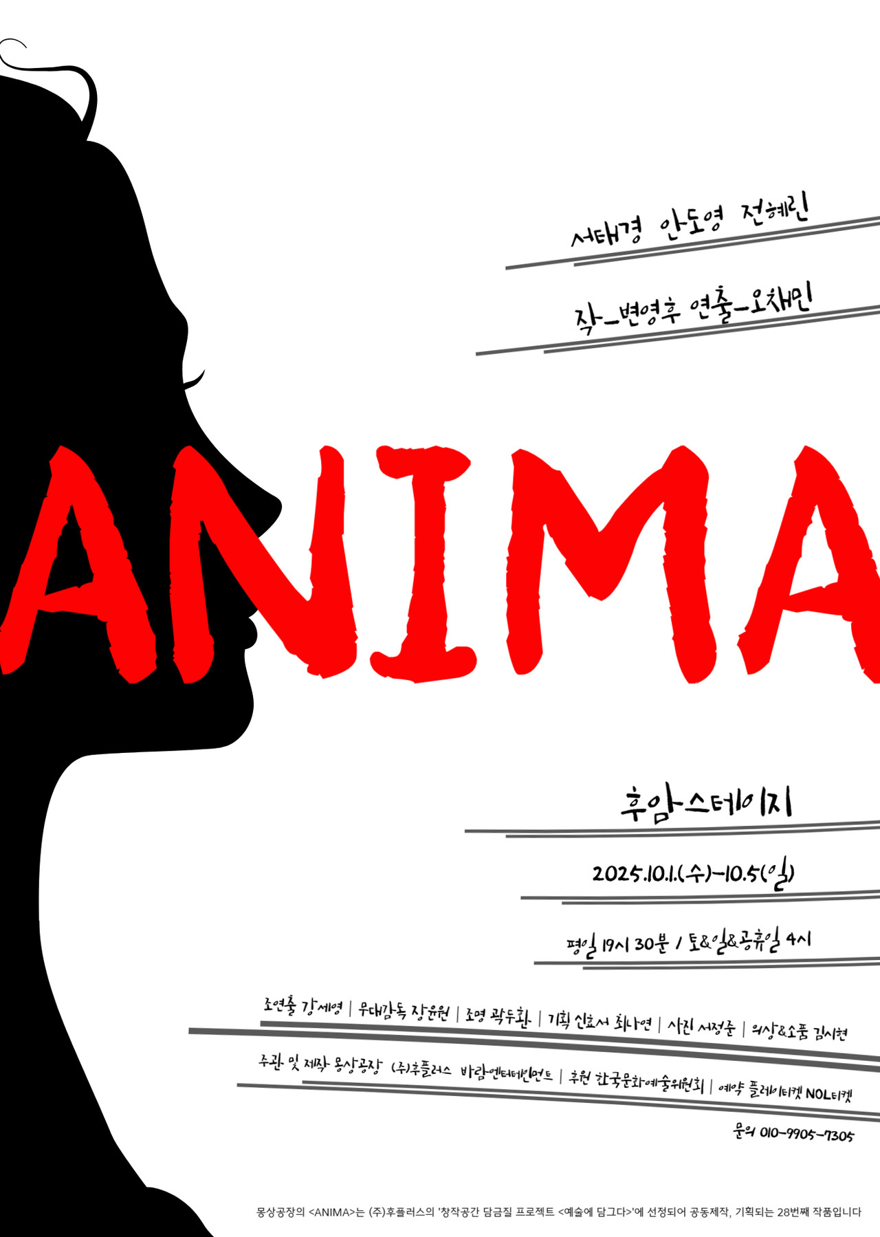 <ANIMA>는 기발한 상상력과 실험적 시도로 꾸준히 창작극을 선보여온 창작집단 몽상공장의 대표작으로, ㈜후플러스에서 ‘창작공간 담금질 프로젝트 <예술에 담그다>’에 선정되어 공동제작, 기획되는 28번째 작품이다. 작품성과 화제성을 동시에 입증하나 <ANIMA>의 2025년 무대를 기대해본다. 예약은 ‘NOL티켓’과 ‘플레이티켓’에서 가능하다.