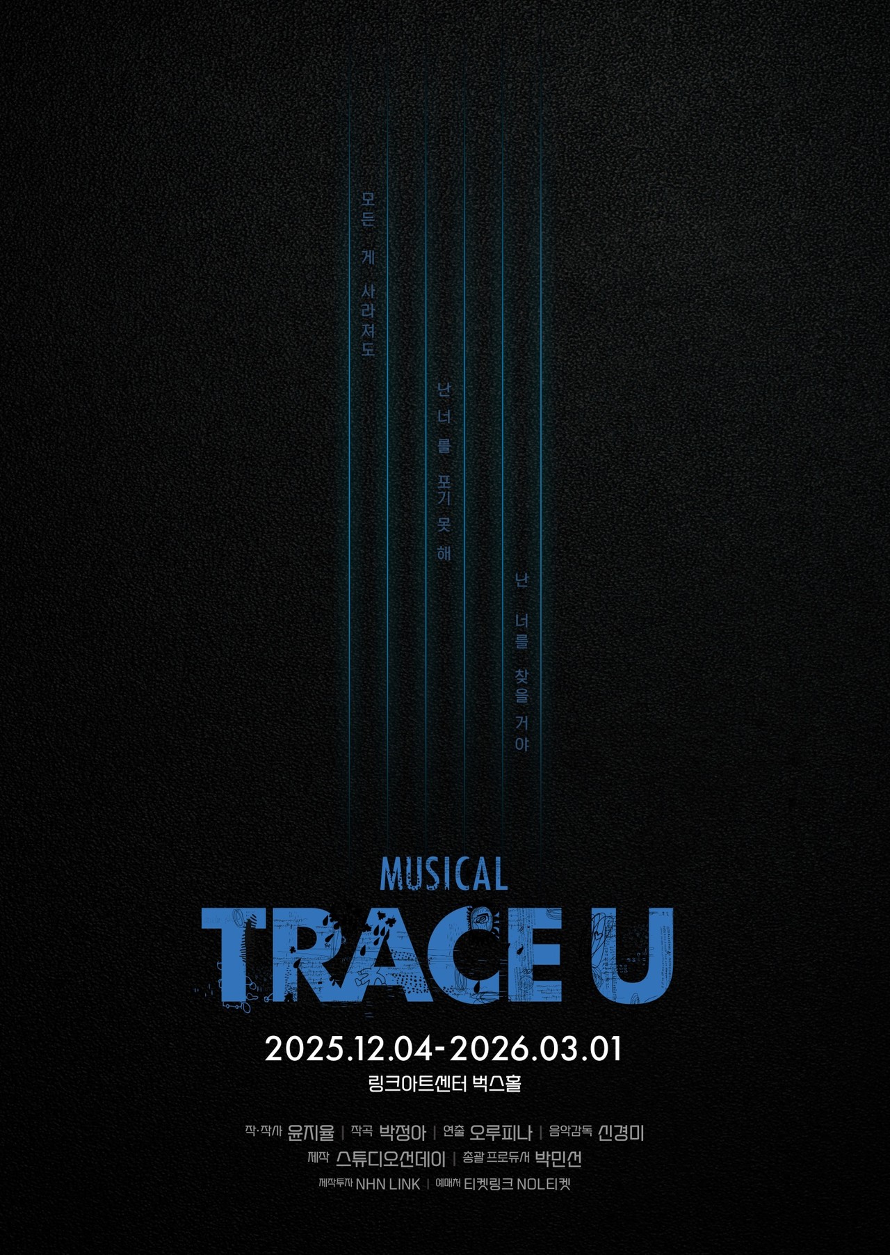 배우들이 만들어낼 무대와 더불어, 작품의 완성도를 책임질 창작진 역시 눈길을 끈다. 뮤지컬 〈트레이스 유〉의 세계관을 단단히 다져온 윤지율 작가와 박정아 작곡가, 그리고 음악적 완성도를 책임져온 신경미 음악감독이 다시 의기투합해 작품의 정체성을 이어간다. 여기에 뮤지컬 〈와일드 그레이〉, 〈이터니티〉 등 다수의 화제작을 통해 자신만의 색채를 구축해온 오루피나 연출이 새롭게 합류해 작품에 신선한 해석을 더한다. 아울러 무대, 영상, 조명, 음향 등 디자인 파트에 새로운 디자이너들이 참여해 각기 독창적인 감각을 더하며, 기존 창작진과의 협업이 만들어낼 무대에 기대가 모아진다.