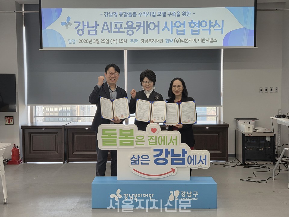 강남복지재단(이사장 이의신)은 3월 25일 오후 2시, 재단 11층 대회의실에서‘2026년 강남 AI 포용케어 사업 협약식’을 개최했다.