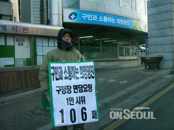 광진구(구청장 김기동) 관내 노점상인들이 지난해 10월 실시한 노점상철거과정에 대해 공정성의 문제를 제기하고 나섰다. 지난 15일 광진구청 앞 사거리에서 119일째 농성하며 구청장 면담을 요구하고 있는 모습.