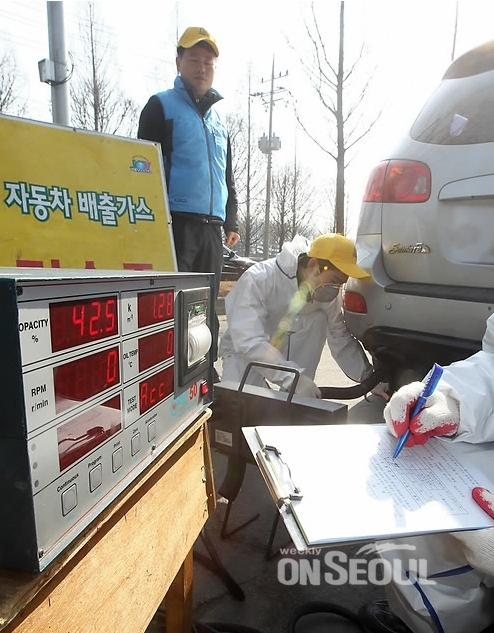15일 서초구(구청장 진익철) 우면동 소재 한 도로에서 구청 관계자들이 미세먼지 없는 깨끗한 환경을 조성을 위해 무료로 자동차 배출가스 점검을 실시하고 있다. 구에 따르면 경유 자동차를 대상으로 매주 화요일 오후 2시부터 4시까지 자동차 배출가스 무료 점검을 실시 중이다.