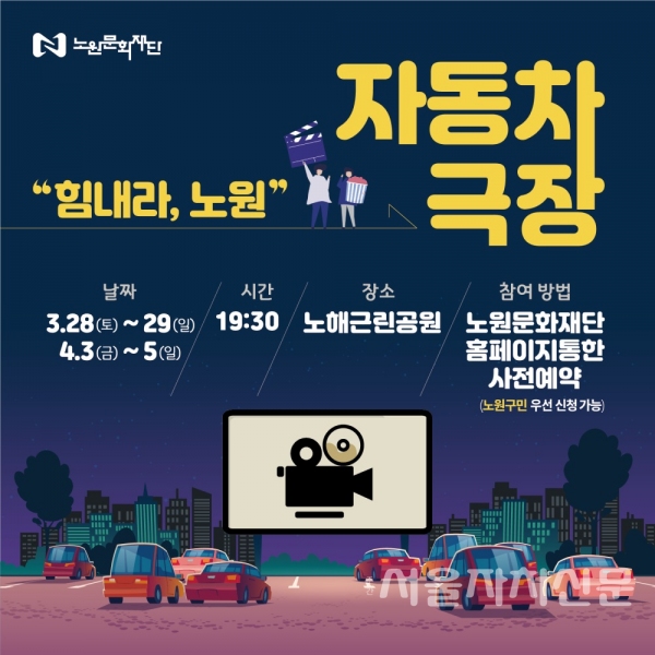 노원구(청장 오승록)는 신종 코로나바이러스 감염증(이하 코로나19) 확산 방지를 위한 ‘사회적 거리두기’를 적극 반영해 자동차 안에서 영화를 즐길 수 있는 ‘힘내라, 노원! No.1 자동차극장’을 운영한다고 지난 26일 밝혔다.