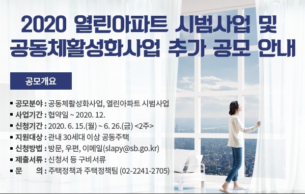 서울 성북구(구청장 이승로)는 상생하고 소통하는 열린아파트 만들기 조성을 위하여 26일까지 『2020 열린아파트 시범사업』에 참여할 단지를 모집한다고 한다.