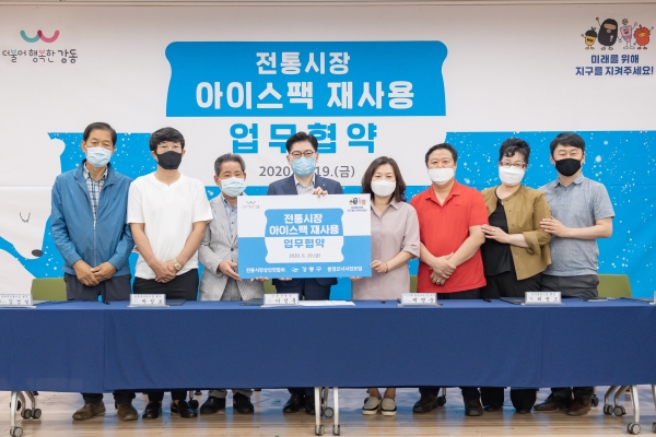 전국 최초로 아이스팩 재활용 수거 시스템을 구축한 강동구(구청장 이정훈)가 19일(금) 구청 5층 대강당에서 전통시장상인회, 환경오너시민모임과 ‘전통시장 아이스팩 재사용 업무협약’을 맺었다.