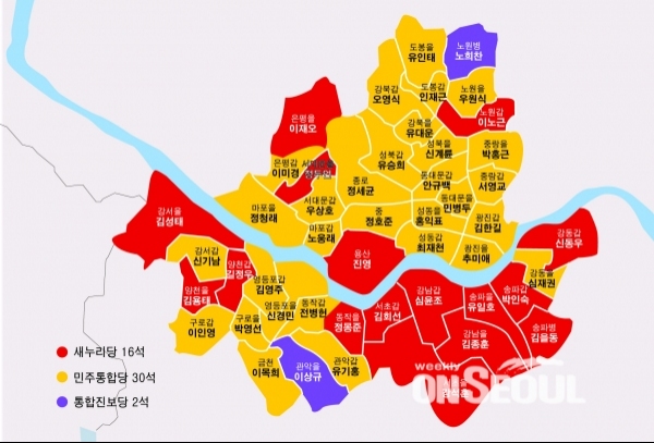 새누리당은 표심의 바로미터로 상징되는 서울에선 민주당에 30곳(새누리당 16곳 우세)을 내주며 전반적으로 열세를 면치 못했으나 호남을 제외한 영남과 충청, 강원에서 압승을 거뒀고 인천, 경기에서도 민주당과 대등한 승부를 펼치며 총선 승리를 거머쥐었다.