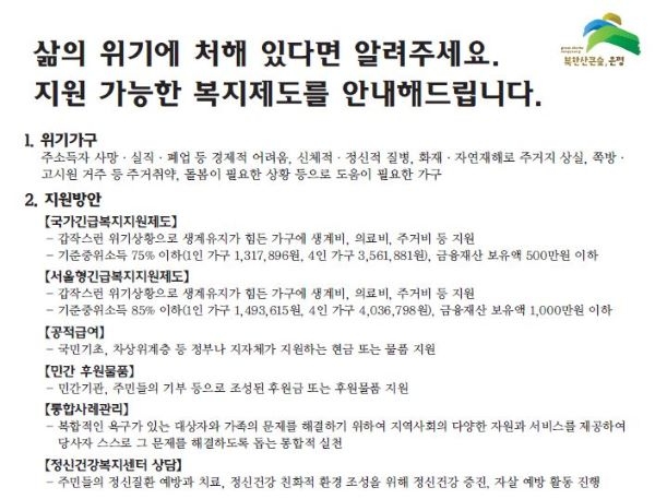 구 관계자는 “은평구는 복지제도를 몰라서 지원받지 못하는 경우가 없도록 복지사각지대 발굴을 위해 노력하고 있다. 복지는 우리의 일상과 아주 밀접하고 가까이 있으므로 어려움이 있다면 주저말고 손을 뻗어 도움을 청하시길 바란다. 또한 주변의 위기상황을 발견한다면 제보해주시기를 부탁드린다”고 전했다.