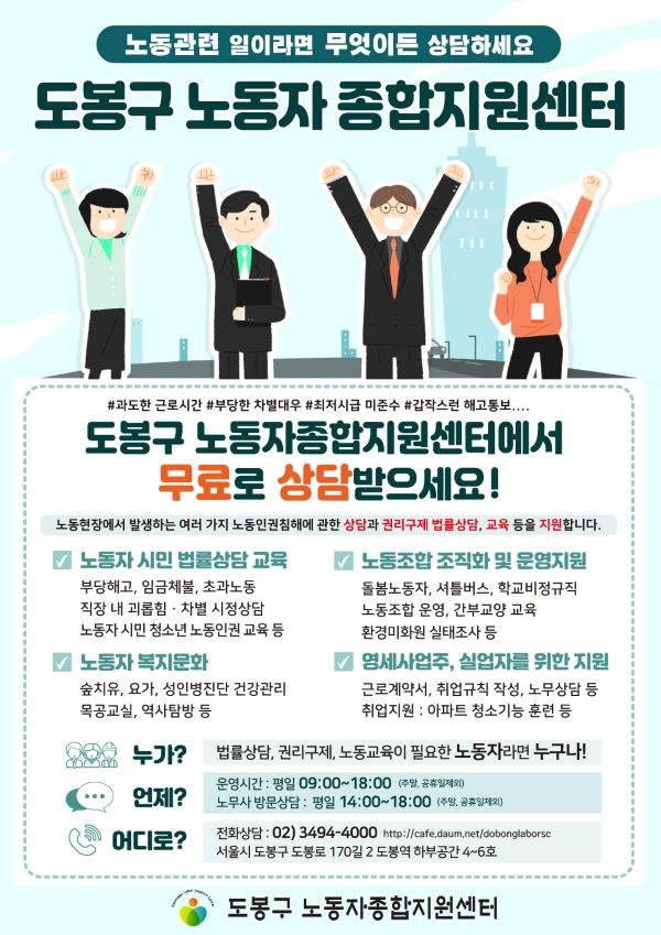 도봉구 노동자종합지원센터는 노동자를 위한 기관으로 △부당해고 △임금체불 △초과노동 △직장내 괴롭힘 차별 등의 상담과 △시민청소년 노동인권교육 등의 ‘노동자 시민법률상담과 교육’이 이뤄진다.