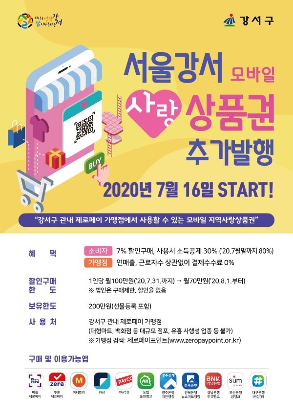 노현송 구청장은 “강서사랑상품권에 대한 많은 관심에 감사드리며, 코로나19로 위축된 소비를 되살리고자 상품권을 추가 발행하게 되었다”라며, “이번 추가발행을 통해 관내 소상공인 매출 증대에도 기여해 지역경제가 활성화되길 바란다”라고 말했다.