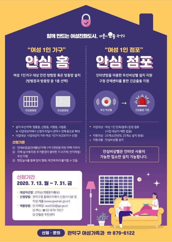 관악구(구청장 박준희)가 여성 1인 가구의 안전한 주거생활 지원을 위한 안심홈·안심 점포 설치·지원 사업을 실시한다.