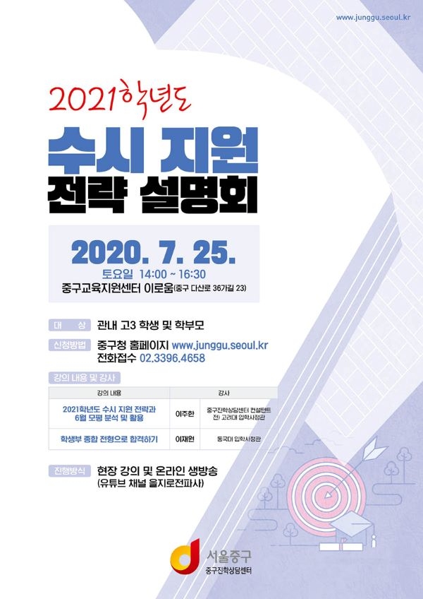 중구(구청장 서양호)가 오는 25일(토) 오후 2시 곧 문을 열게 될 '중구 교육지원센터 이로움'에서 '2021학년도 수시 지원 전략 설명회'를 개최한다.