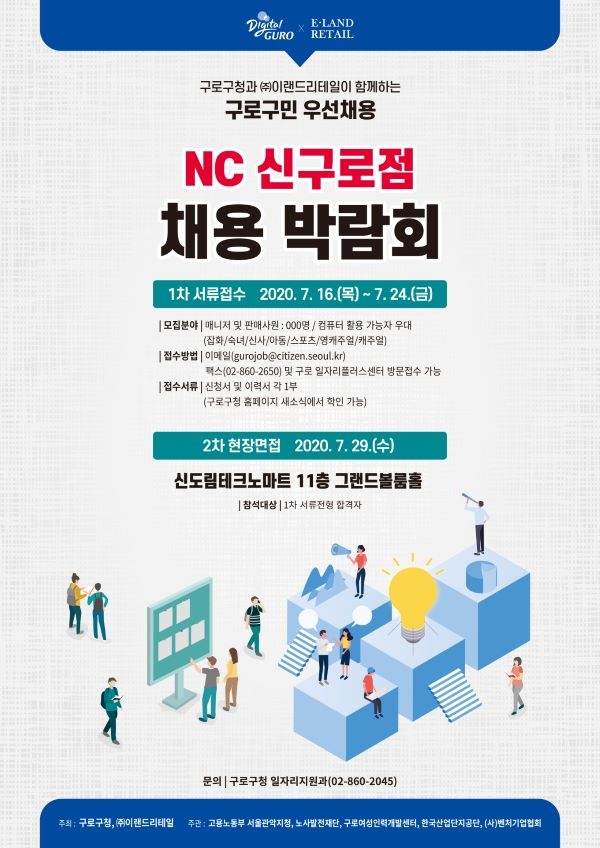 구로구는 NC백화점 신구로점 개점으로 대규모 신규 인력 수요가 발생할 것으로 예상하고, 이랜드리테일측과 구민 우선 채용을 위한 논의를 지속해왔다. 지난해 12월에는 일자리 창출을 위한 상호협력을 약속하는 업무협약도 체결했다. 이에 따라 양측은 구로구민들에게 우선 취업의 기회를 제공키로 하고 채용박람회를 공동개최하게 됐다.