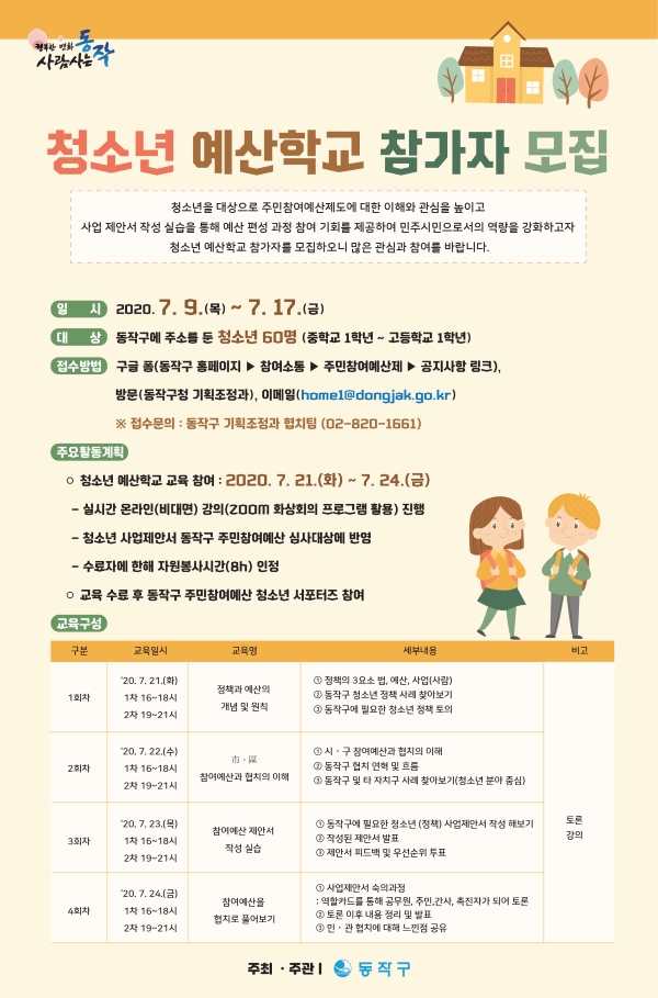 동작구(구청장 이창우)가 오는 17일까지 청소년 예산학교 참여자를 모집한다고 밝혔다.