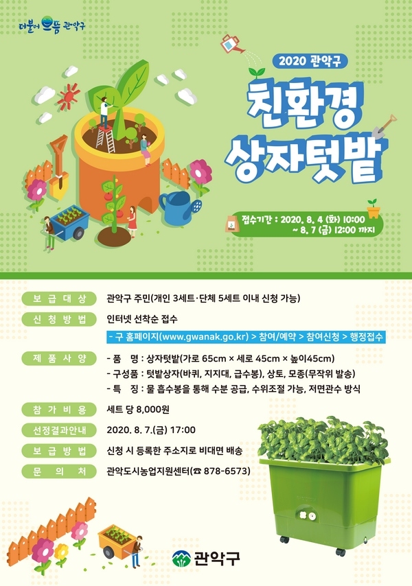 선정결과는 8월 7일(금) 오후 5시 이후 관악구청 홈페이지 공지 및 문자로 개별 안내할 예정이며, 신청한 상자텃밭세트는 신청인의 주소지 또는 소재지로 직접 배송, 비대면으로 전달할 계획이다.