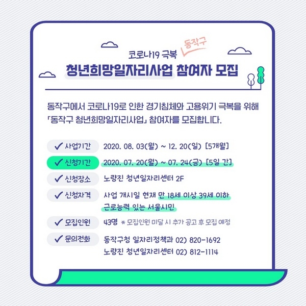 동작구(구청장 이창우)가 오는 24일(금)까지 ‘코로나19 극복 청년희망일자리사업‘ 참여자 43명을 모집한다고 밝혔다.