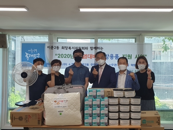 서울특별시사회복지협의회 산하 서울에너지복지시민기금은 이문1동 홀몸어르신을 위해 쿨토시, 쿨스카프, 절전용콘센트, 마스크, 장바구니 등 5세트를, 이문2동 통장협의회는 통장들과 일대일 결연을 맺은 가구를 위해 인견 상·하 20세트(60여만 원 상당)를 지원했다.