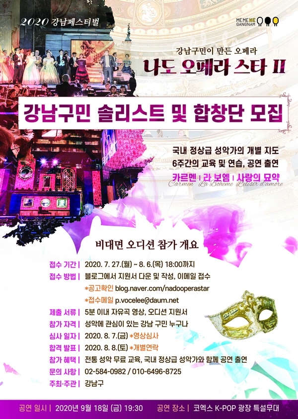 ‘기분 좋은 변화, 품격 있는 강남’을 실현 중인 강남구(구청장 정순균)가 내달 6일까지 2020 강남페스티벌 프로그램 중 하나인 ‘나도 오페라스타 시즌Ⅱ’ 공연에 참여할 구민 솔리스트와 합창단원을 모집한다.