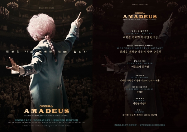 올 연말, 깊은 공감과 강렬한 여운으로 다시 한번 감동의 무대를 선사할 연극 <아마데우스>는 오는 11월 17일부터 2021년 1월 17일까지 광림아트센터 BBCH홀에서 공연되며, 오는 10월 22일 인터파크와 YES24에서 프리뷰 티켓 오픈이 진행될 예정이다.