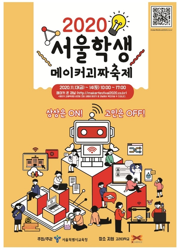 서울특별시교육청(교육감 조희연)은 11월 13일(금) ~11월 14일(토)동안 「2020 서울학생 메이커괴짜축제」를 온라인 플랫폼인 “메이커 온 채널”(http://makerfestival2020.co.kr/)에서 온라인·오프라인 병행으로 개최한다.